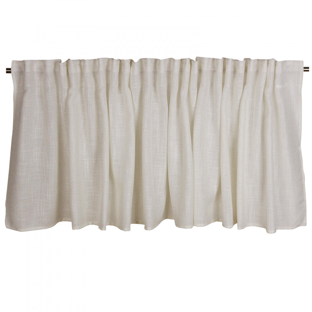 Yksivärinen valkoinen verhokappa monitoiminauhalla. Kangas läpikuultava. Kankaan kuviointi jäljittelee pellavan kuviointia. Verhossa monitoiminauha, jota voit...