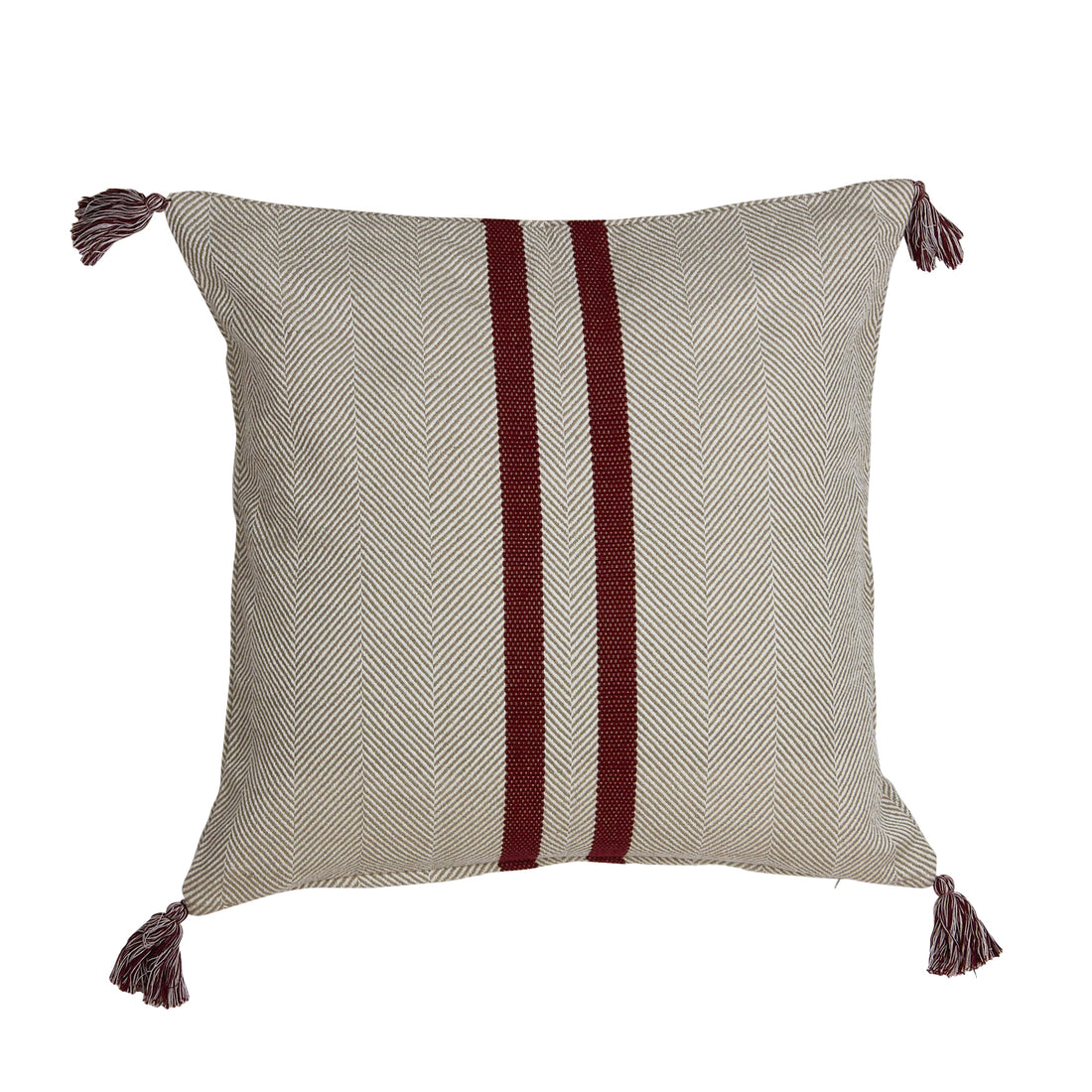 Jouluinen tyynynpäällinen, tasselit kulmissa (puna/pellavanväriset), "kalaruoto"kuvio, punaiset kaksi raitaa keskellä, vetoketju alareunassa. Väri pellava/punainen Koko...