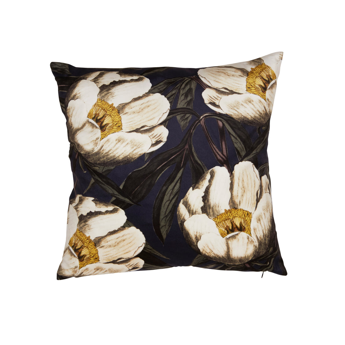 Tummansinipohjainen koristetyynynpäällinen kauniilla valkoisilla kukilla, toinen puoli musta sametti. Koko 50x50cm Materiaali 100% polyestersametti Vesipesu...