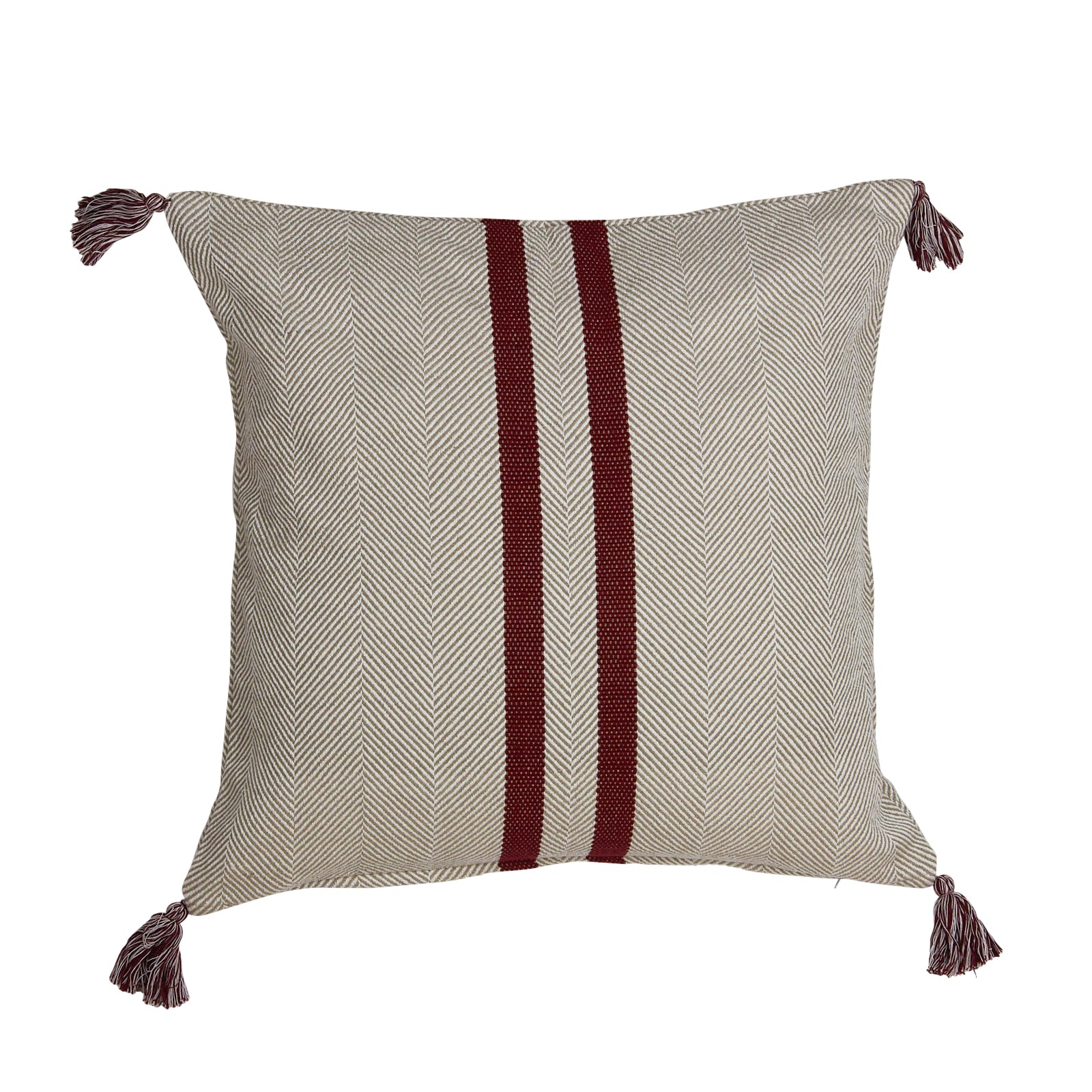 Jouluinen tyynynpäällinen, tasselit kulmissa (puna/pellavanväriset), "kalaruoto"kuvio, punaiset kaksi raitaa keskellä, vetoketju alareunassa.