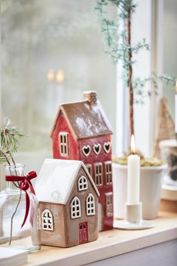 Ib Laursenin talolyhty. Tämä lyhty on Ib Laursenin My Home Town lyhtysarjaa. Lyhtyssä voi tavallisten tuikkujen sijaan käyttää myös LED tuikkuja tai pieniä patterikäyttöisiä valosarjoja.