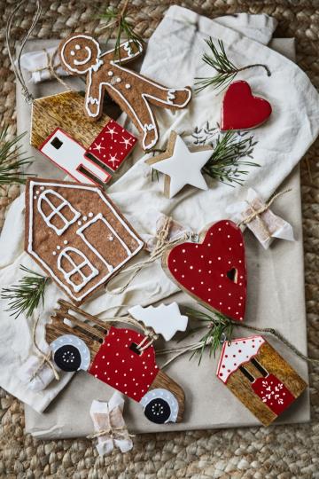 Herttaiset mangopuusta valmistettu talot juuttinauhalla. Punaiseksi maalattu, valkoisin pienin pistein. Kauniina yksityiskohtana pienet kaiveretut ikkunat.