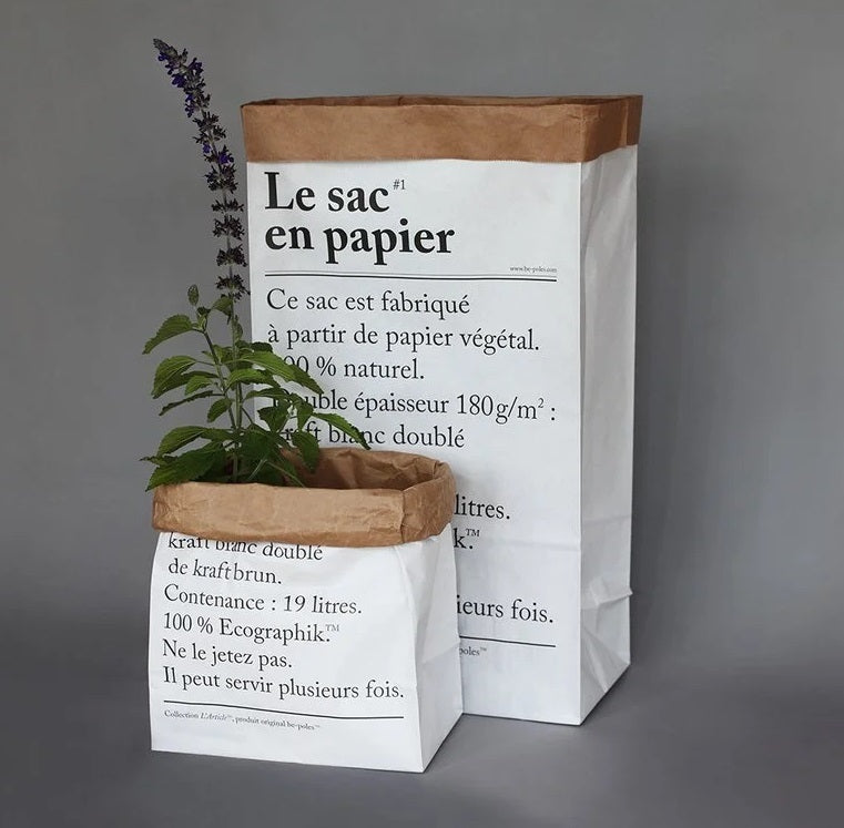 Kestävästä orgaanisesta voimapaperista valmistettu trendikäs paperipussi monenlaisiin eri käyttötarkoituksiin sisustuksessa.