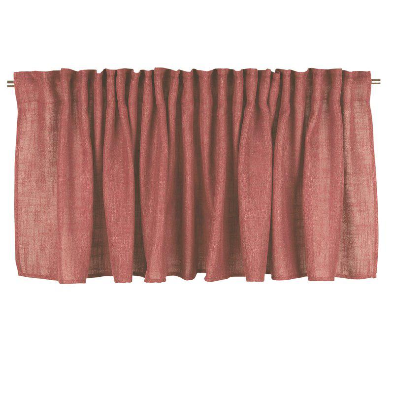 Yksivärinen valkoinen verhokappa monitoiminauhalla. Kangas läpikuultava. Kankaan kuviointi jäljittelee pellavan kuviointia.